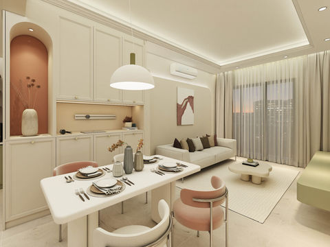 In this French modern classic design, creamy beige tones create an elegant ambiance, accented by touches of olive green for sophistication. The beige walls and furnishings add warmth, while the green accents bring freshness. This color combination captures the timeless charm of French modern classic style, resulting in an inviting and refined space.