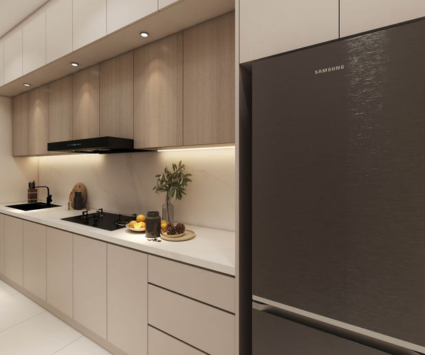 This studio design maximizes storage without feeling cramped. The dining table is seamlessly merged with the kitchen and TV cabinet for a cohesive look. With a modern contemporary style and light colors, the space feels bigger and more open.