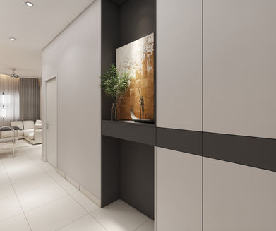 Designed with a minimalist approach, this studio features light grey and dark grey tones. The dining table integrates with the kitchen and TV cabinet, creating a seamless look. The small bedroom includes a tatami design to maximize storage and space efficiency.